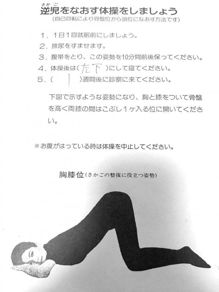 その後の妊娠28週の健診でも逆子判定をされ、ついに逆子体操の指導がありました。