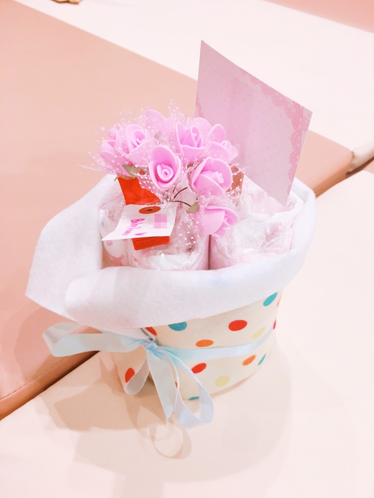 後半は「無事に元気に産まれてきますように」という願いを込めて、紙おむつで簡単なおむつケーキを作りました。
