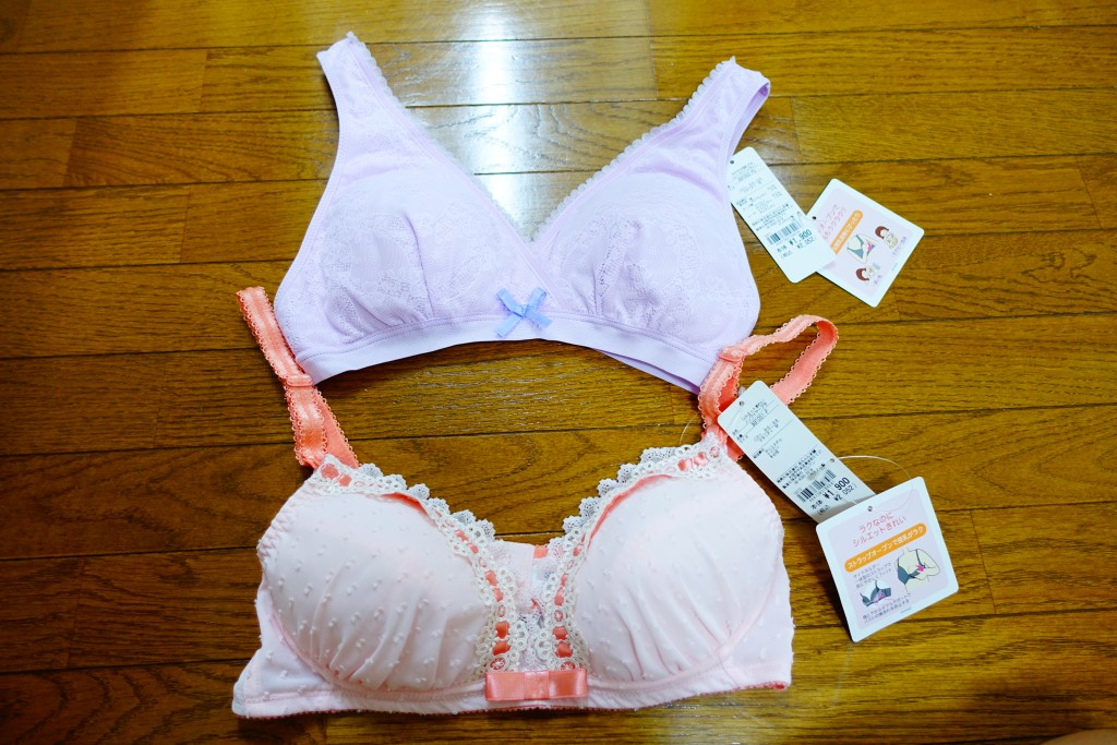 どちらもノンワイヤーですが、ストラップオープンのピンクの方がしっかり支える感じがあるので、シルエットは綺麗かもしれません。