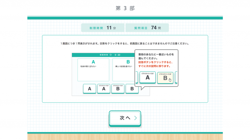 といっても、難しい設問はまったくありません。性格診断、占いのような感じです。