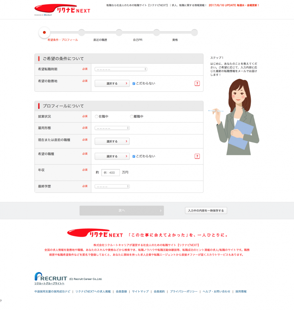ログインすると、最初に以下のような転職サイトらしい情報入力画面になります。