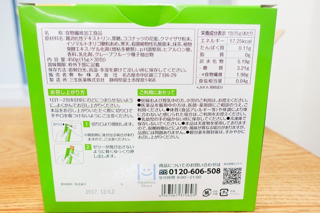 黒糖抹茶青汁寒天ジュレは、なんと1袋当たり17.25kcalという非常に低カロリーなゼリーです。