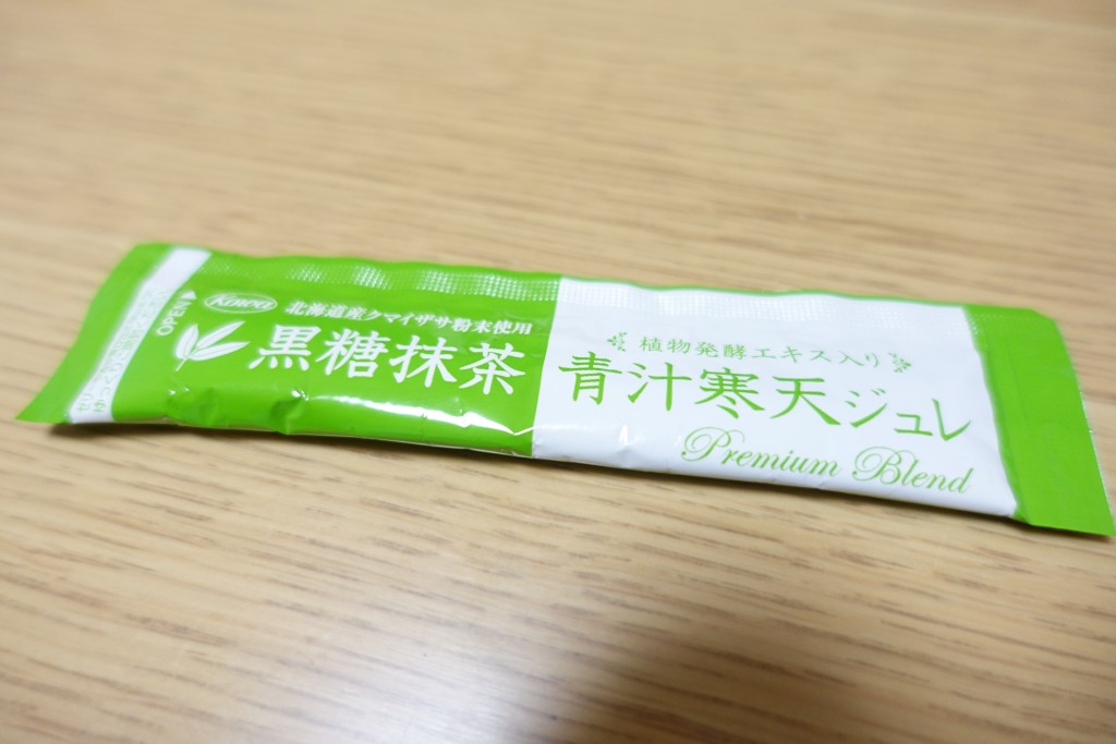 この「黒糖抹茶青汁寒天ジュレ」は、約40種の植物発行エキスを凝縮した青汁の寒天のようなもの。