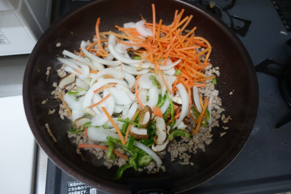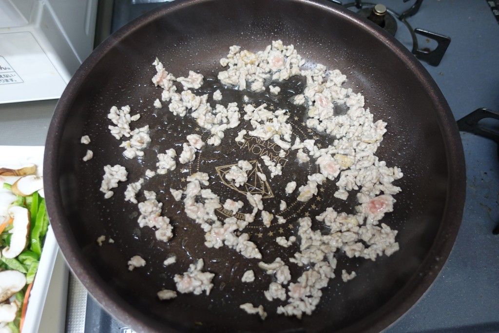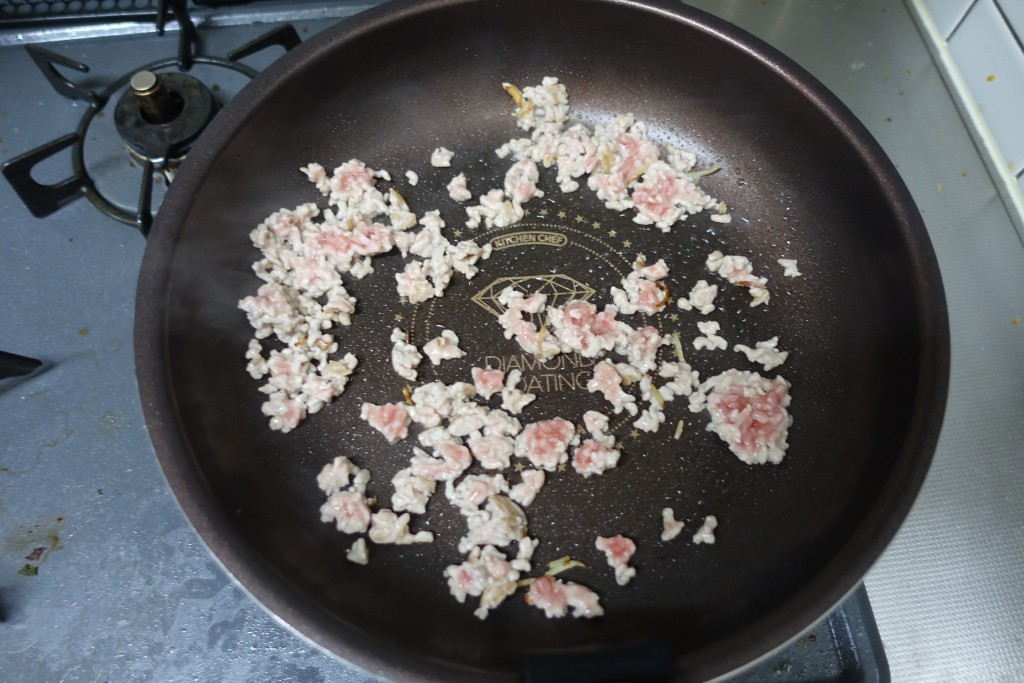 ひき肉を炒め、