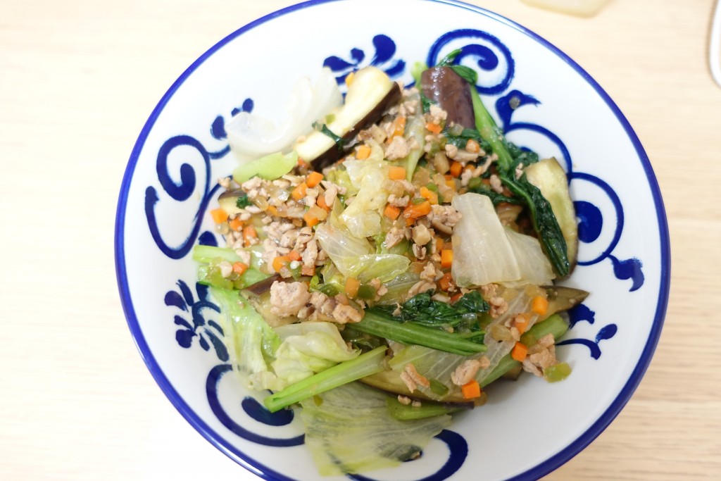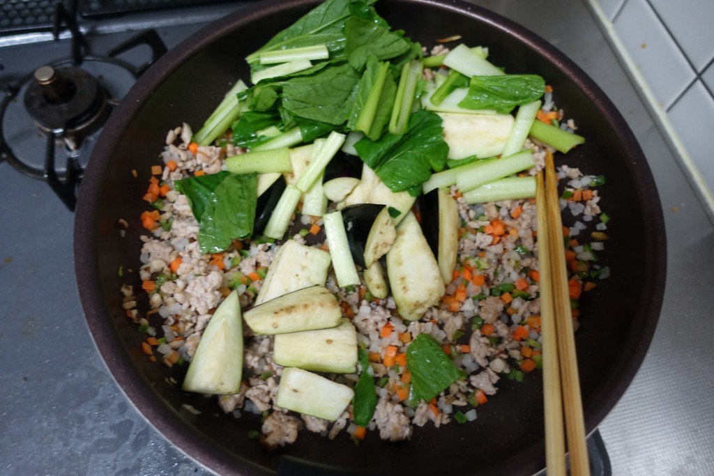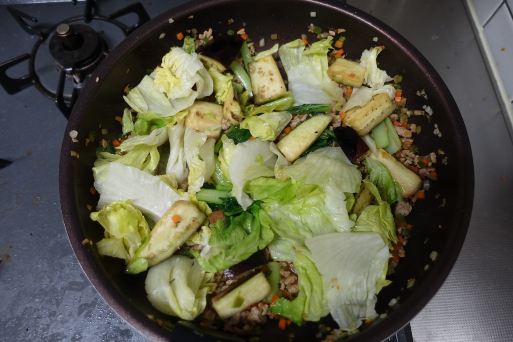 お肉に火が通ったらカット済み野菜を放り入れ、
