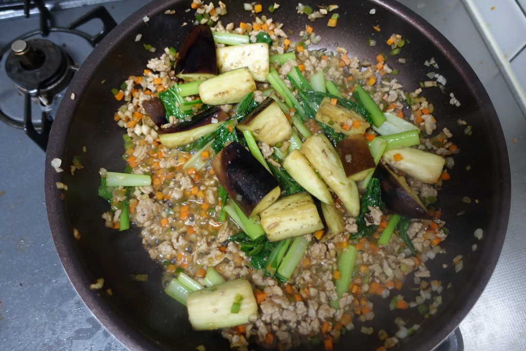 ひき肉を炒めて、