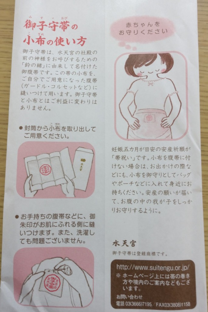 腹帯ではなく、小布を購入した場合の使い方は、下記のとおりです(いただいた封筒にかいてあります)。