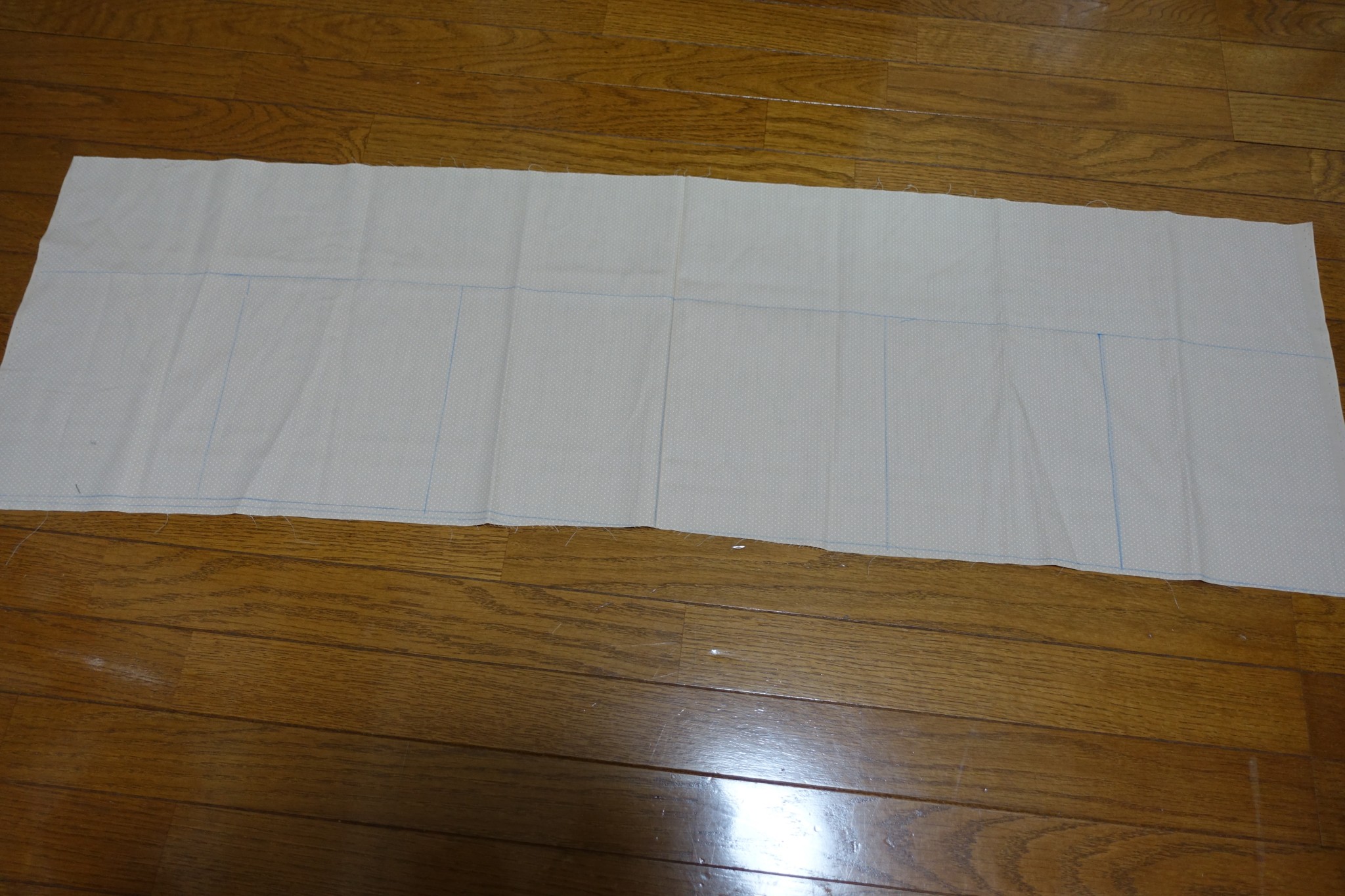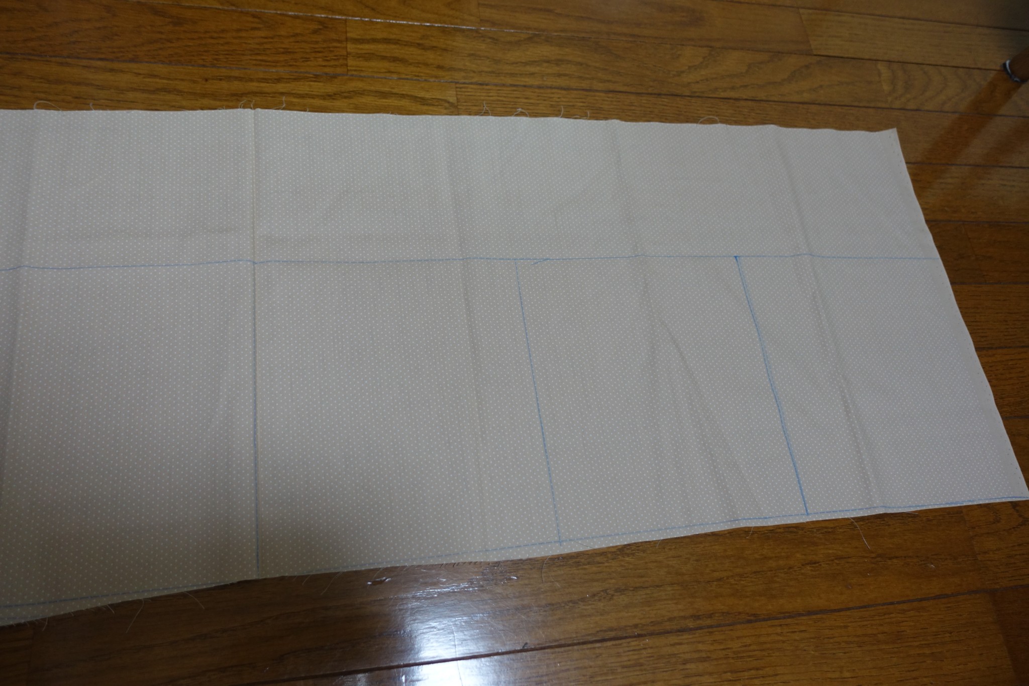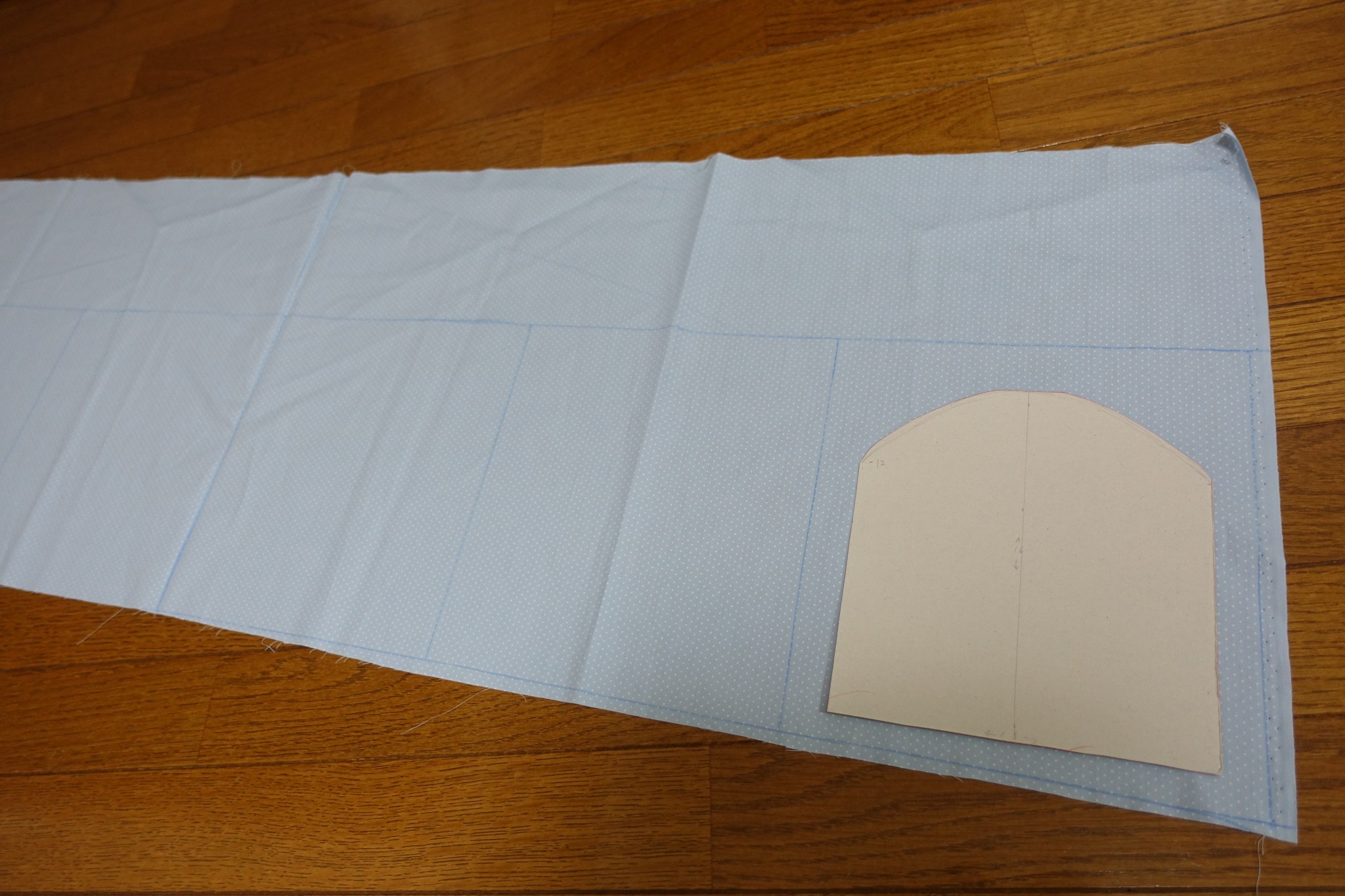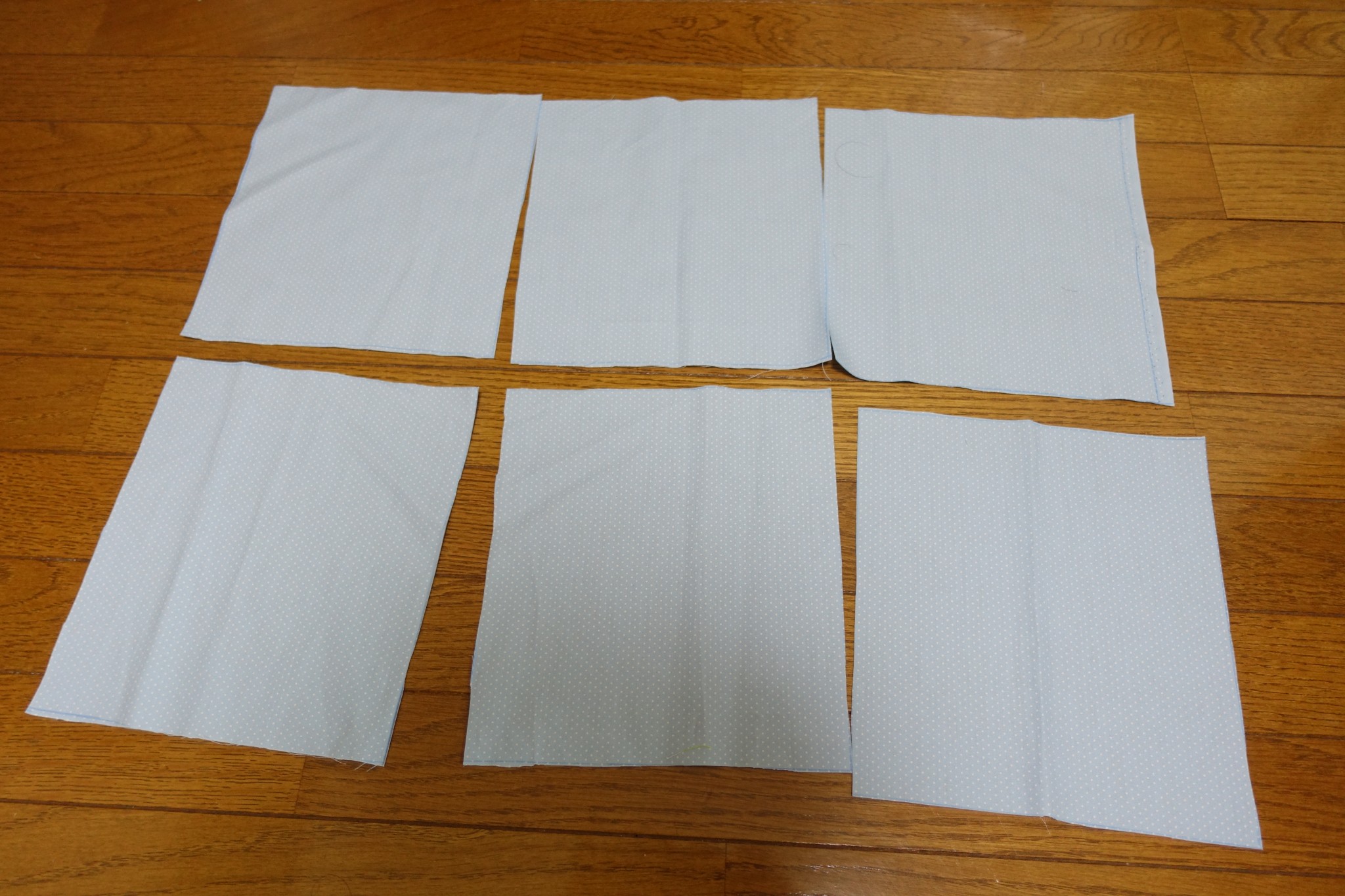 私はこんな感じで型紙を置いて、線を引いてから、まずは長方形6枚に裁断しました。