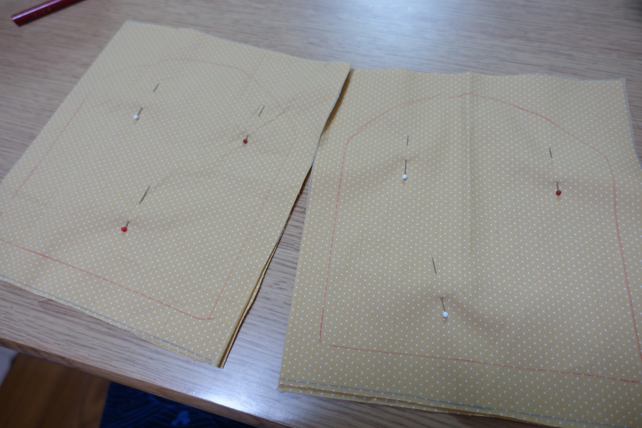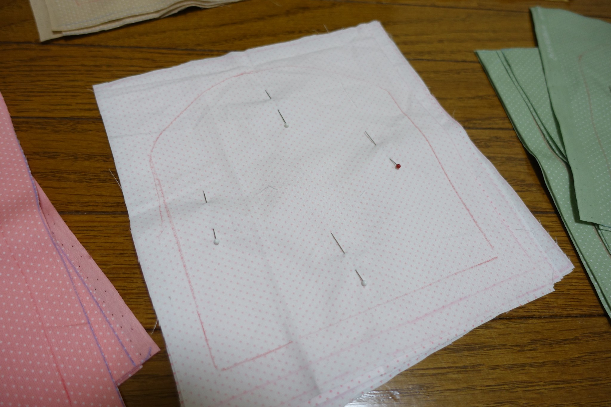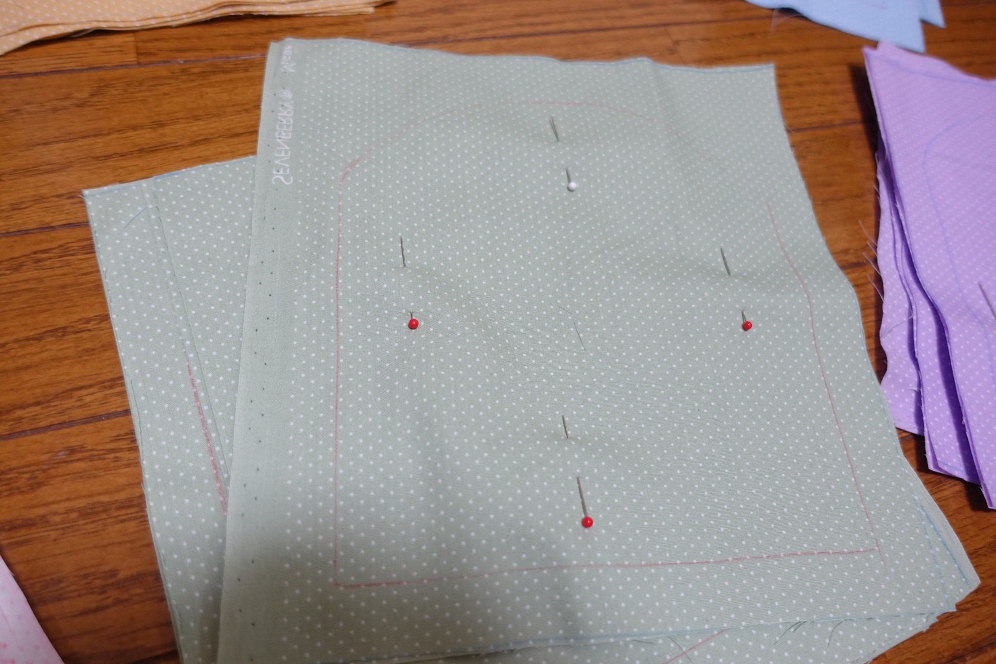 花びら用の布を長方形に裁断したら、こんな感じで2枚ずつまち針をとめます。