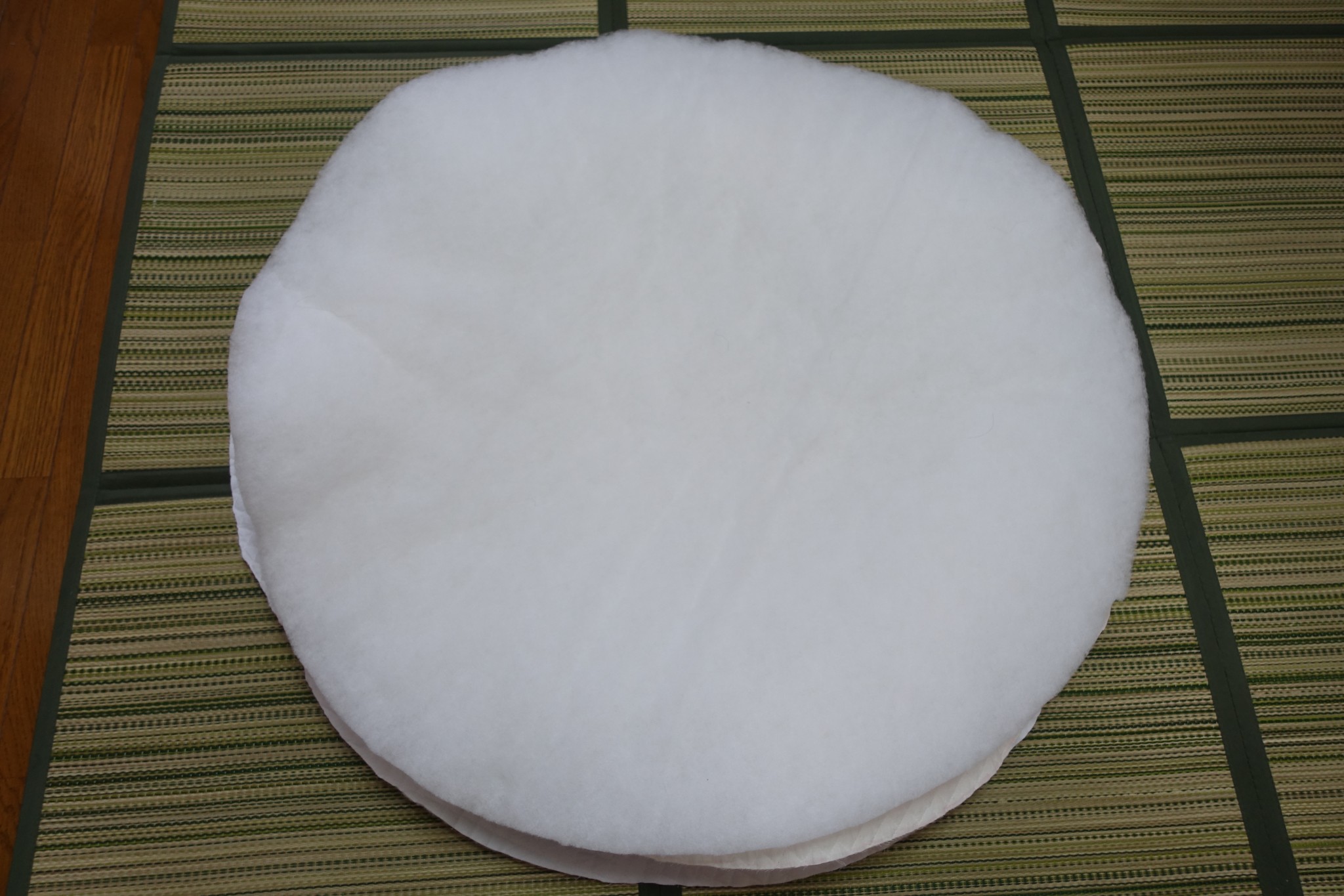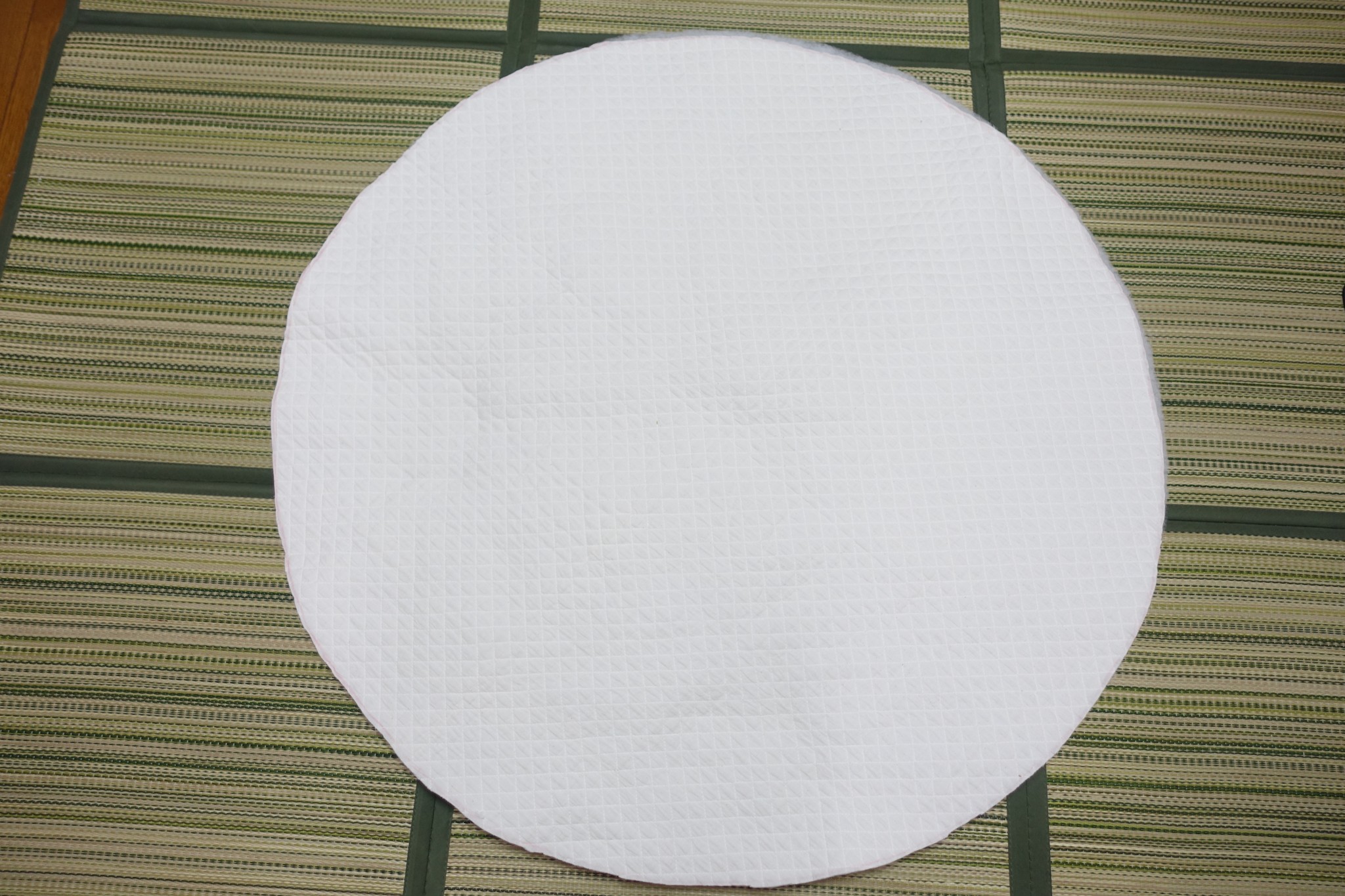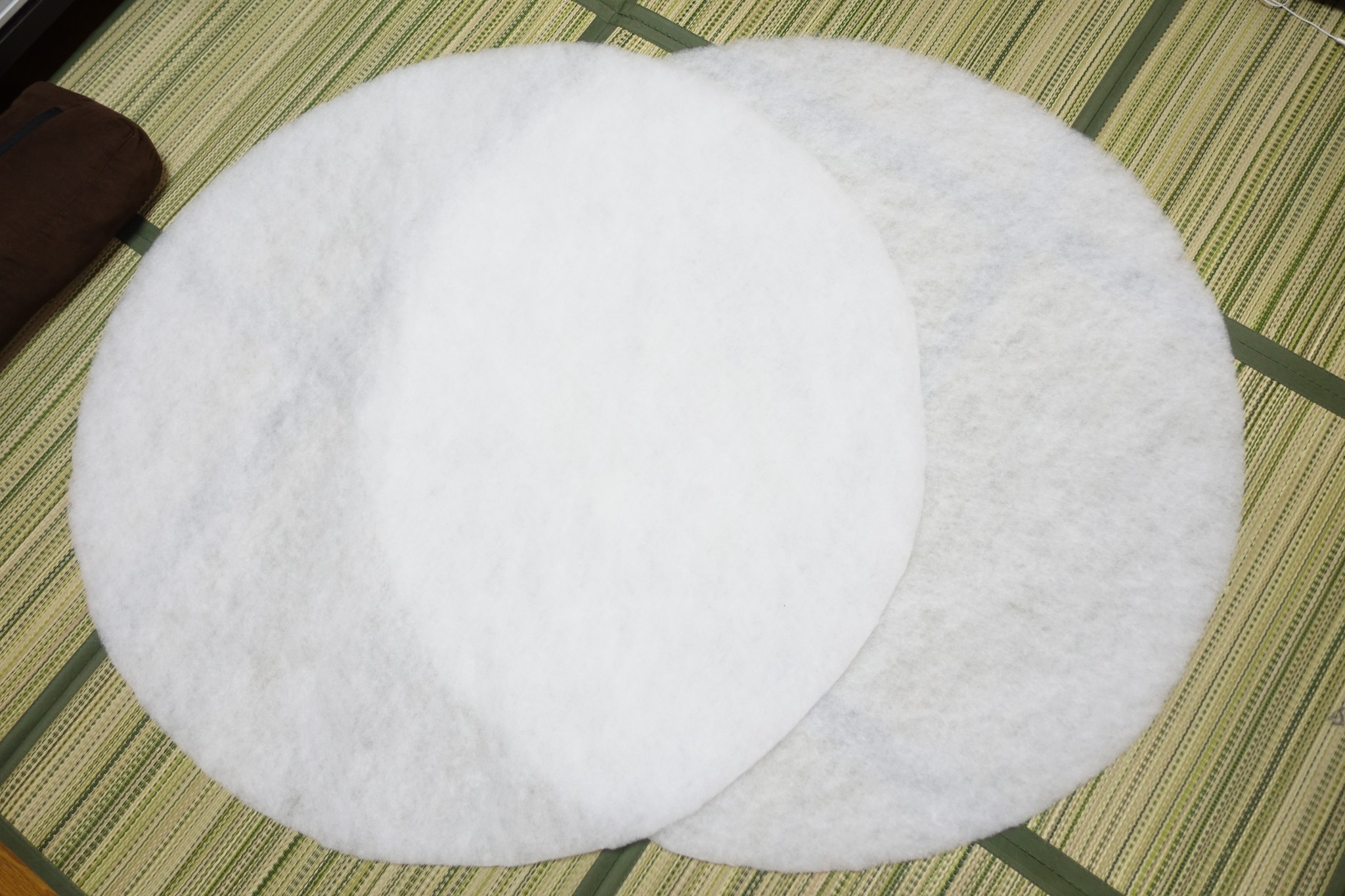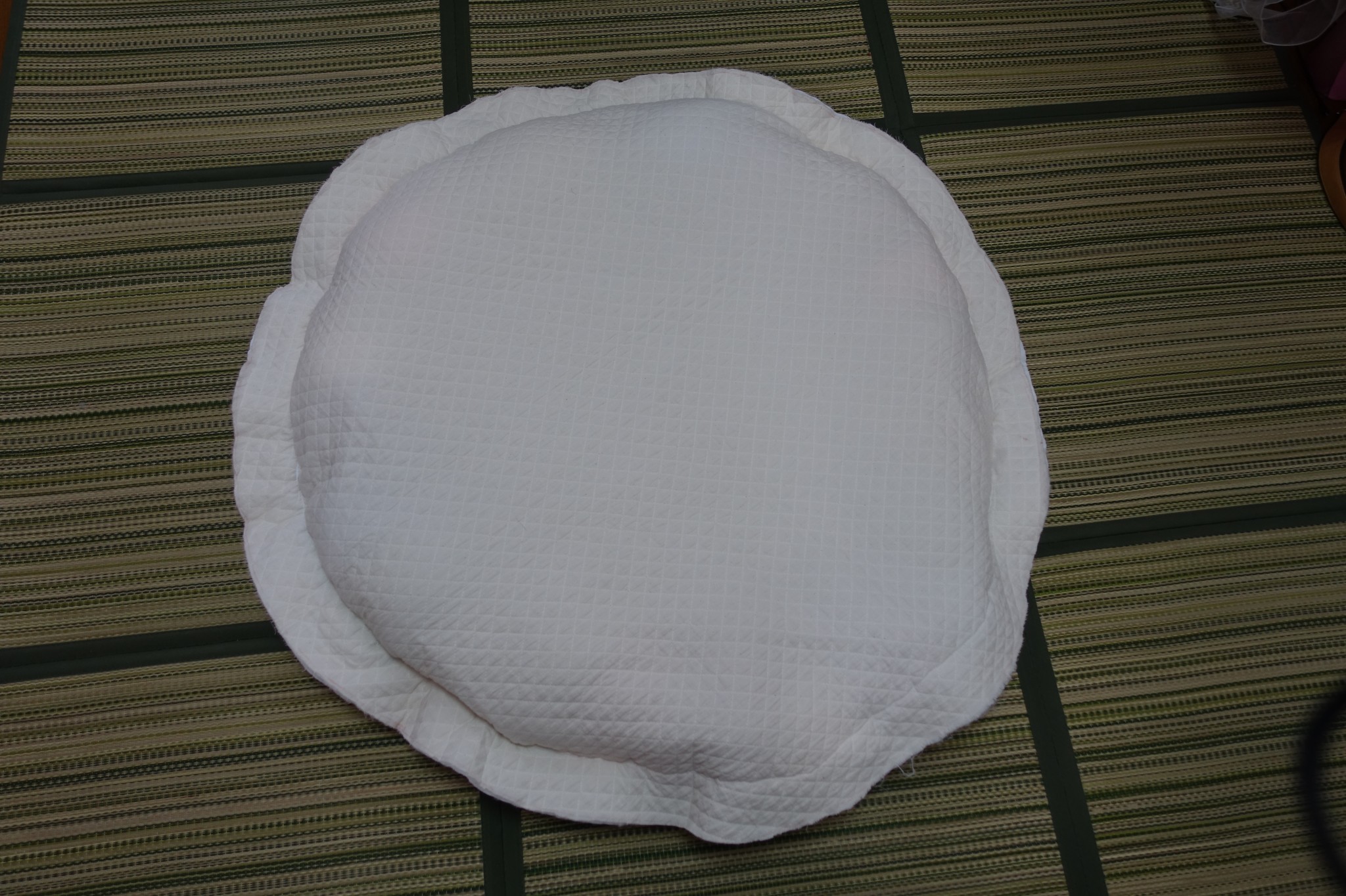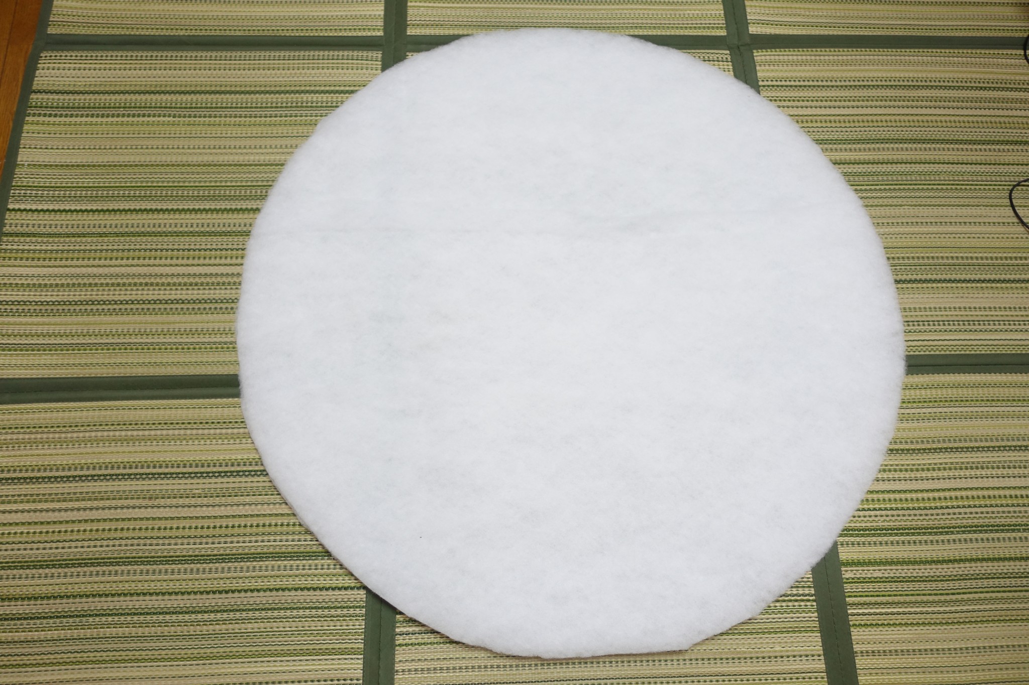 円型キルト布の裏面になる側の上に中綿2枚を重ね・・・