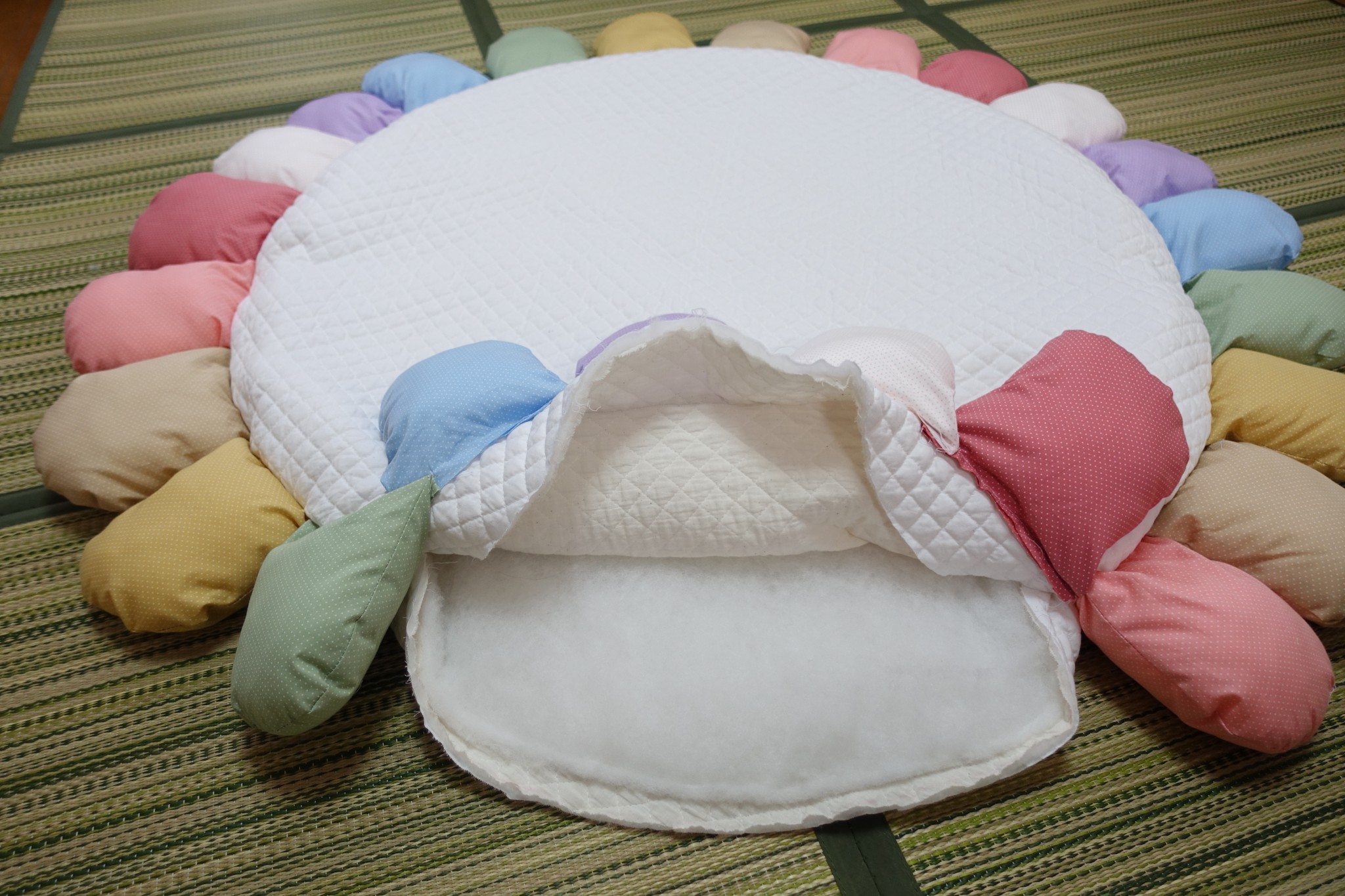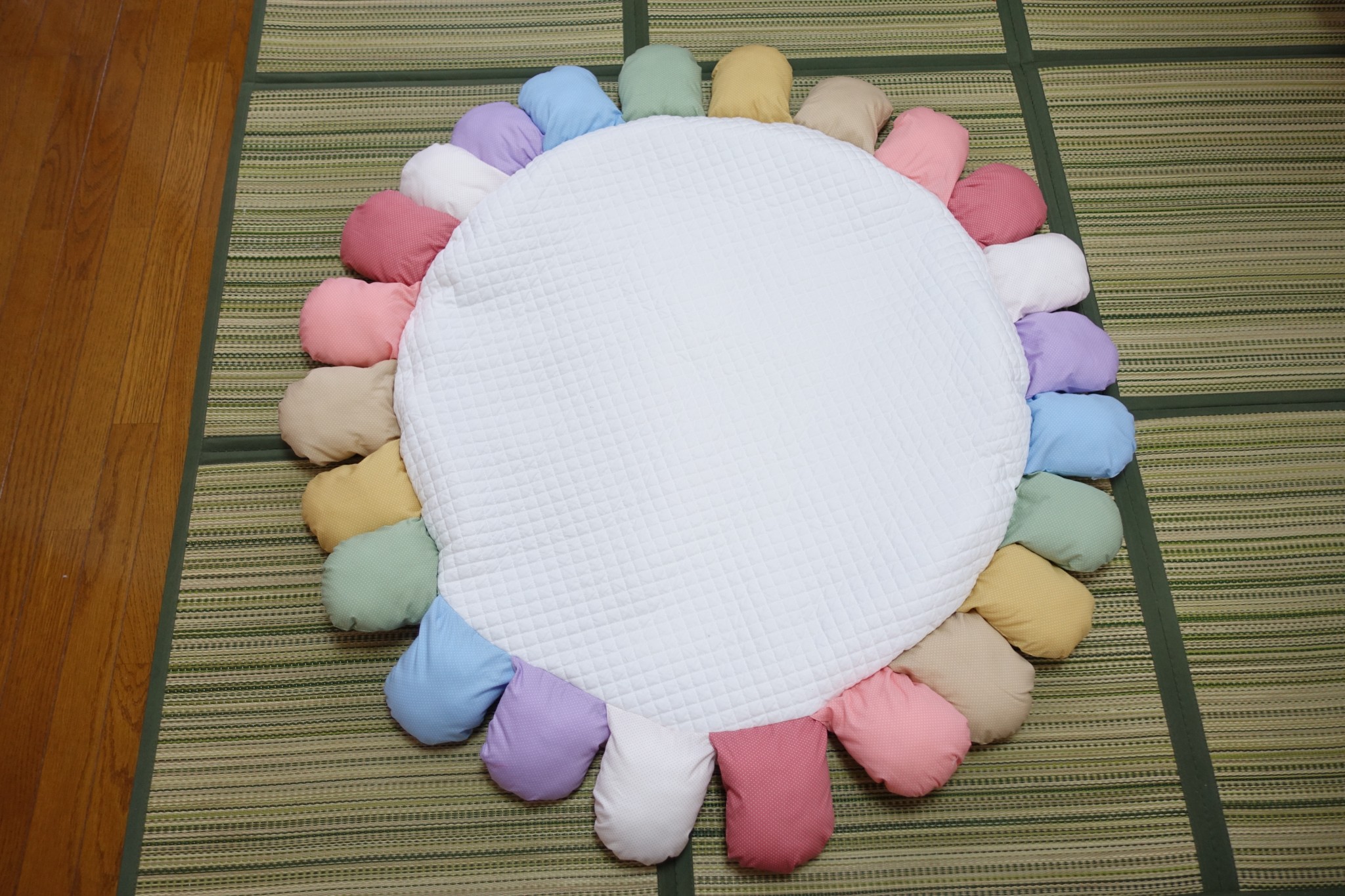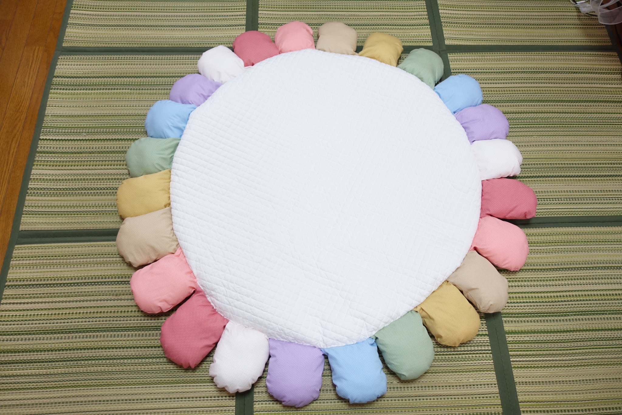サイズは、丸いマット部分の直径が約85cm、花びら部分まで含めた直径が約110cmになりました。